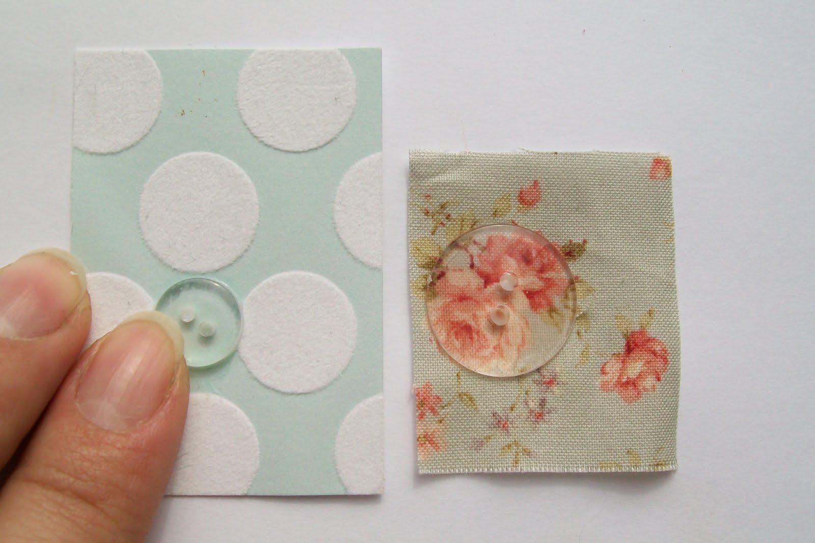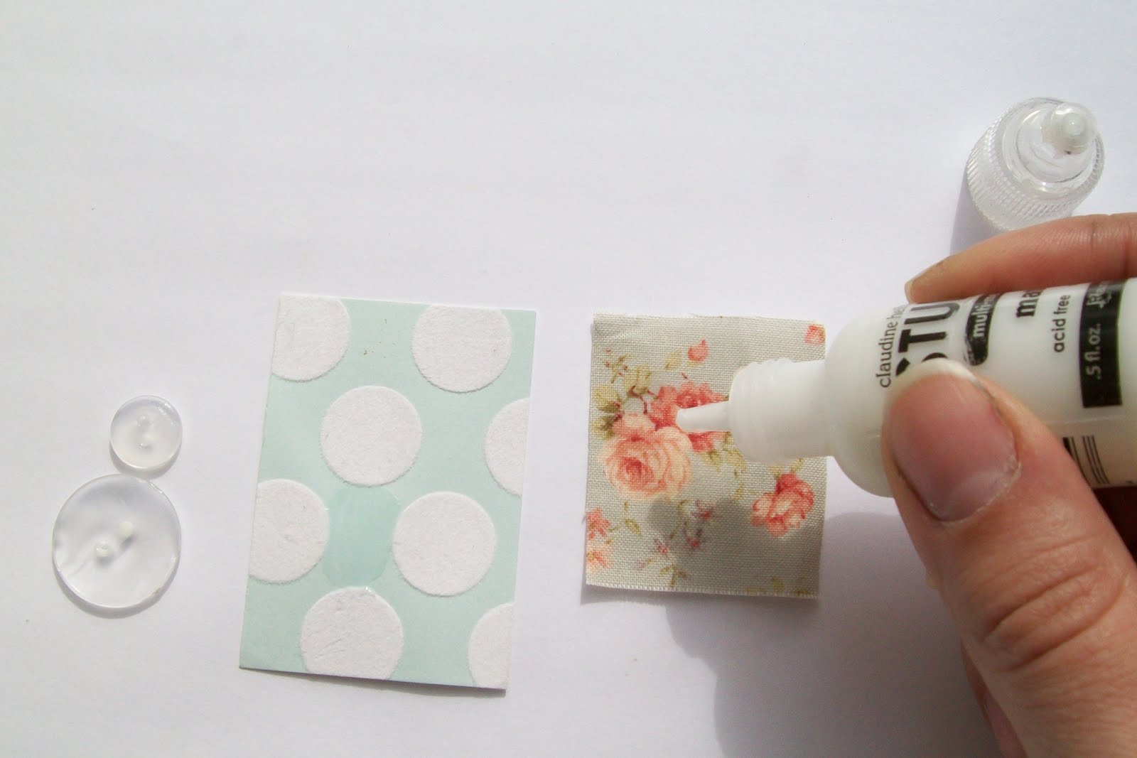 Что касается прозрачных пуговок, то с их помощью можно создать пуговки необходимого вам цвета и даже рисунка. Например, возьмём кусочек скрап бумаги, используемой в работе и кусочек ткани с желаемым принтом, нанесём клей на обратную сторону пуговок, на ткань и на бумагу:
