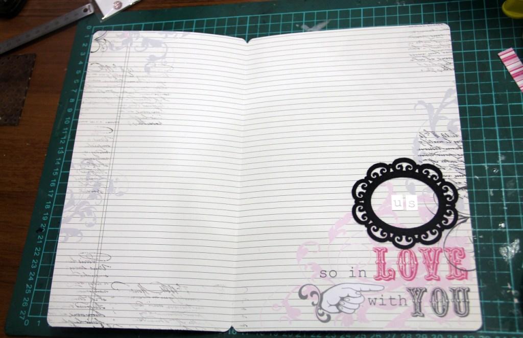 Открываем и немного штампуем внутреннюю часть листа фоновым текстовым штампом. Добавляем яркий акцент (у меня