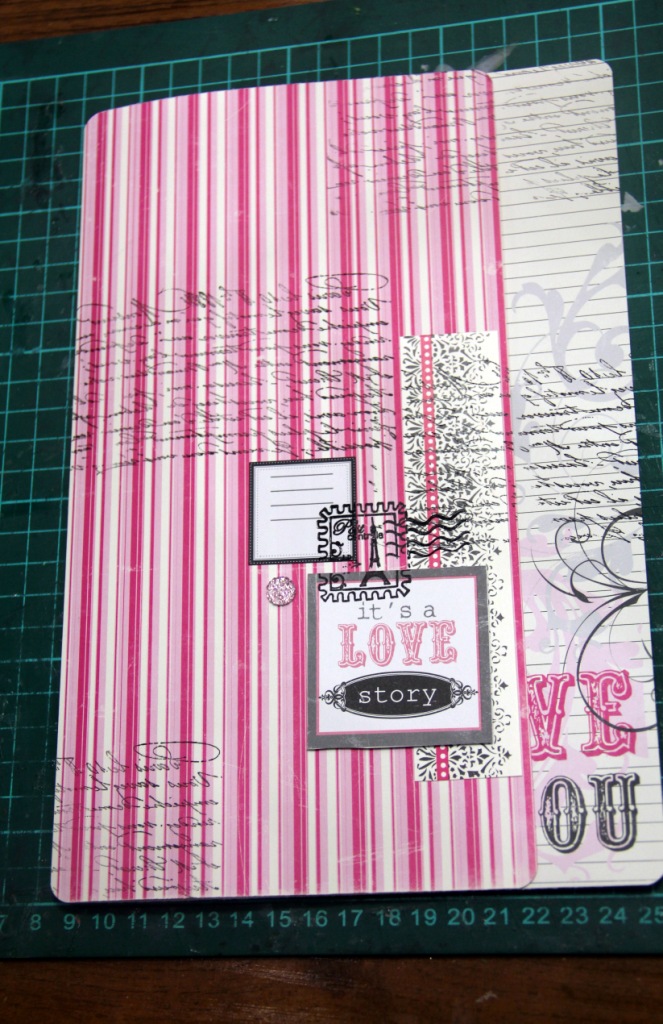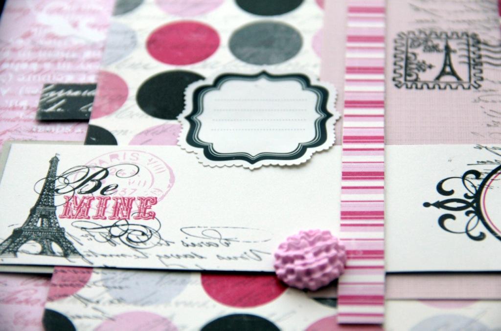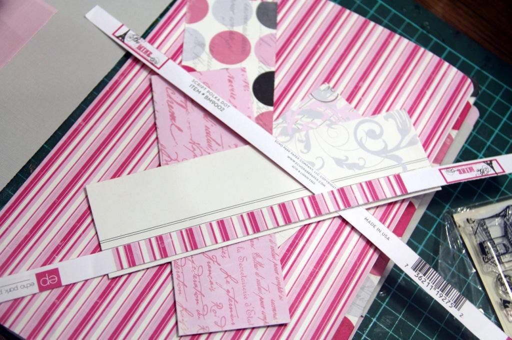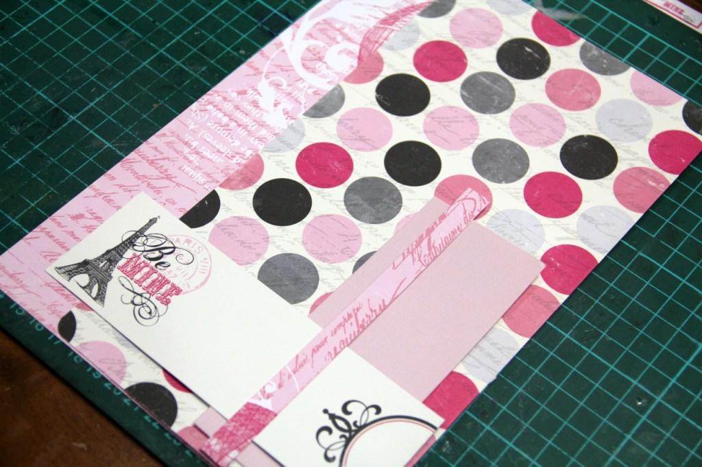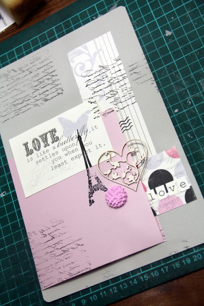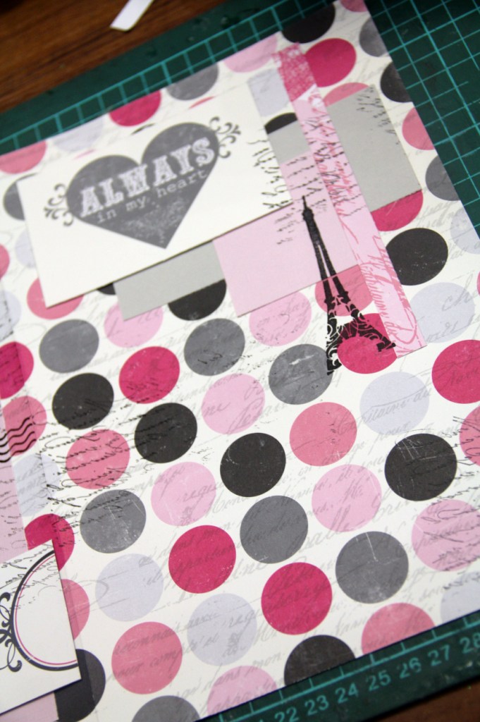 Берем первый лист однотонного кардстока (у меня серый с розовым секретиком) и набрасываем композицию из обрезков бумаги