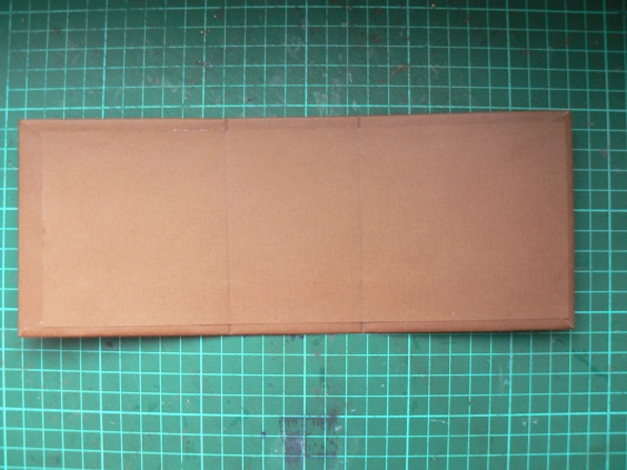 Далее берём оставшуюся часть переплетного материала ( 9,5 х 25,5 см). Приклеивать будем к обратной стороне откидной крышки, только не сразу всю заготовку, а по частям. Начнём клеить от начала и до первой канавки, потом канавку промазываем хорошо клеем (Момент) приклеиваем следующую часть и палочкой аккуратно делаем прогиб, и так далее клеим до конца. Должно получится как на фото.