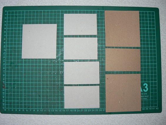 Исходя из размеров блока для записей (мои листочки размером 8,4 х 8,4 см), вырезаем из 1,8 мм картона заготовки с размерами 9,5 х 9,5 см (дно), 2шт. - 9,5 х 6 см и 2 шт. - 9,1 х 6 см (стороны коробочки), а из 0,8 мм картона вырезаем три заготовки для откидной крышки со сторонами: 2 - шт. - 9,9 х 10,3 см., 1 шт. - 10,3 х 6,5см.