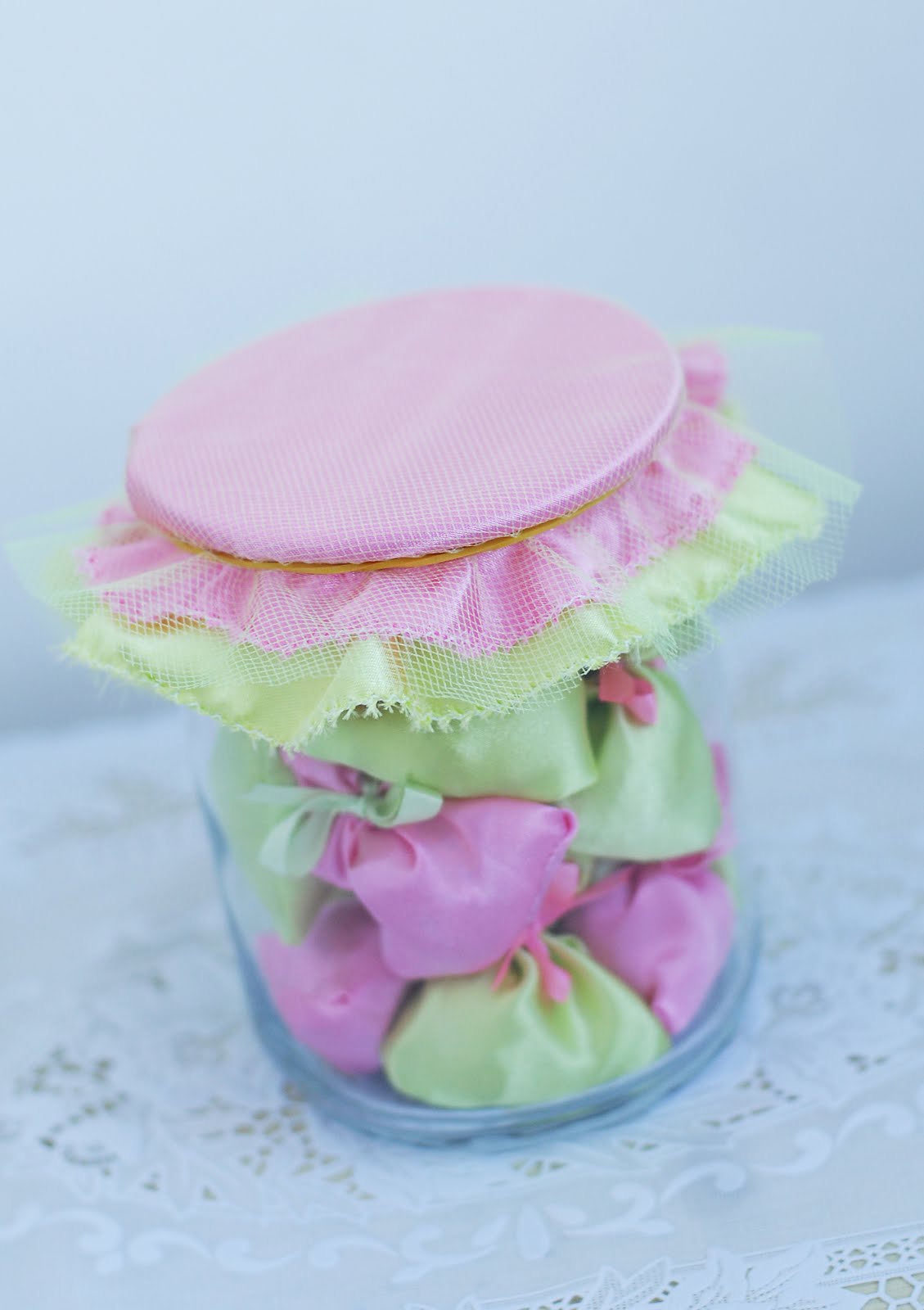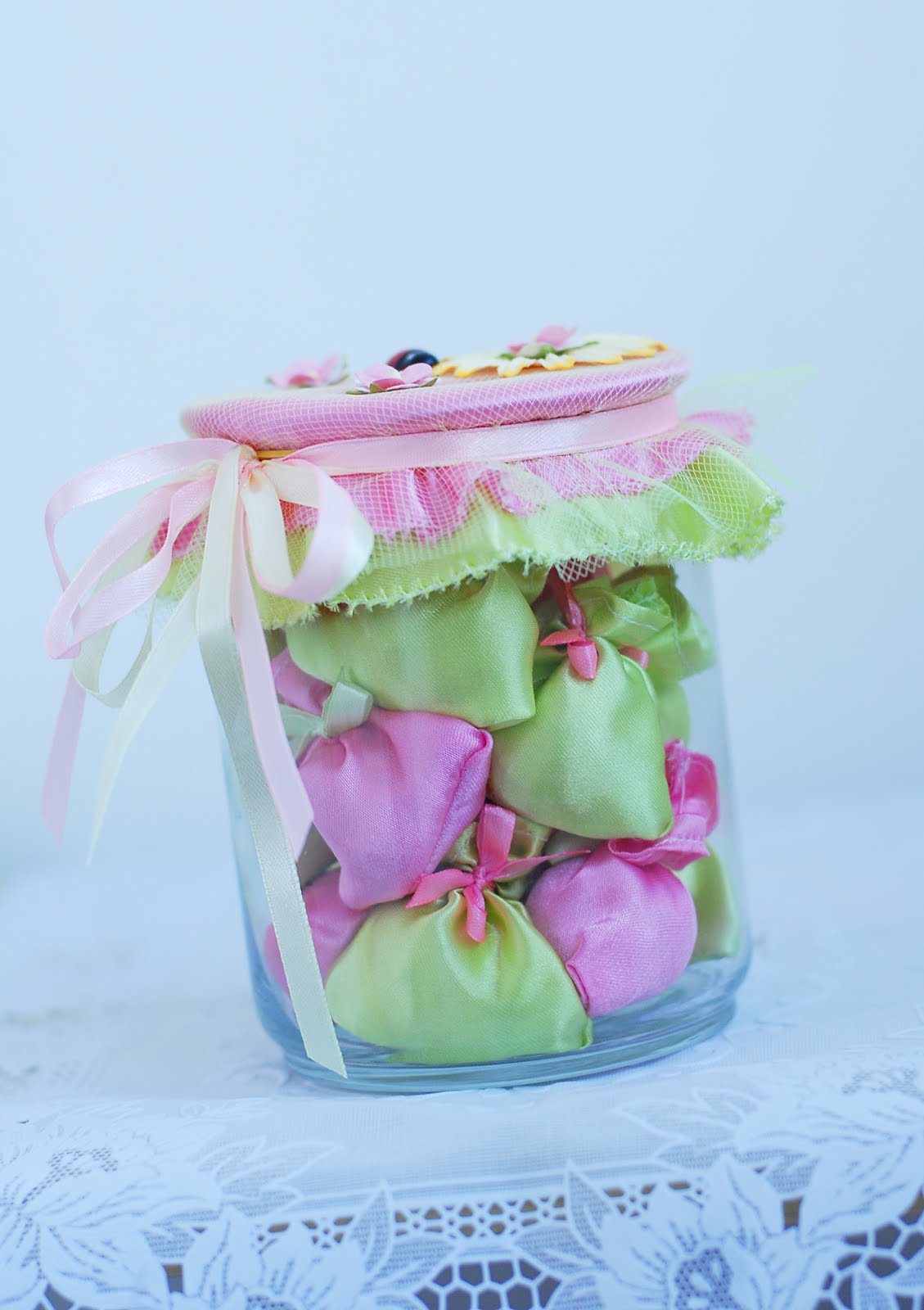 Значит так, каждая конфетка лежит в отдельном, сшитом только для нее, мешочке. А вместе с конфеткой в мешочке лежит бумажка с надписью (надпись может зависить от праздника на который мы дарим баночку, ну и от человека, смотря кому дарим - это и есть сюрприз. Я делала такие просто с милыми пожеланиями, или с маленькими анекдотами, либо же с умными высказываниями, иногда просто с подбадривающими фразочками)