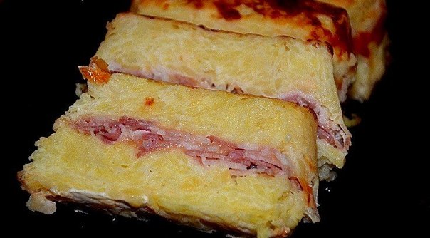 9. На нее кладем слой бекона с луком, смешанные с оставшимся сыром.