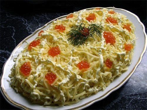 1. Ингредиенты натираем на крупной тёрке и выкладываем слоями: кальмары, белки, картошка, сыр, икра и повторить.