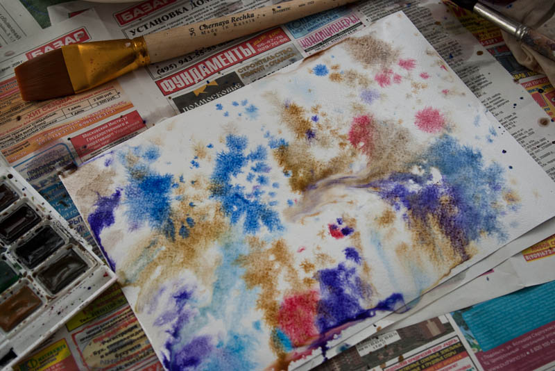 Я добавила ещё тёплых тонов (охра красная), и побрызгала водой - получились такие светлые точки. Не забывайте, что при высыхании краска сильно светлеет.