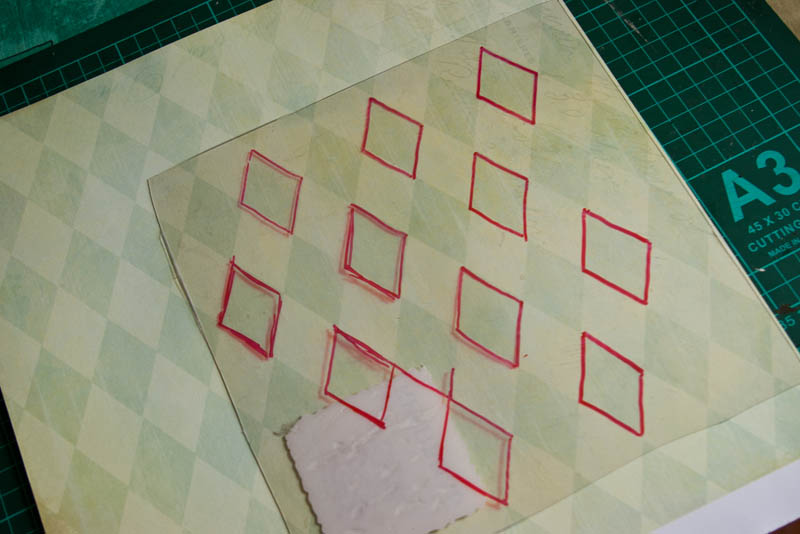 Для это я вырезала трафарет из плотной плёнки (упаковка от торта). Взяла лист с готовым узором, сверху положила плёнку, обвела ромбики, которые потом вырезала макетным ножом.