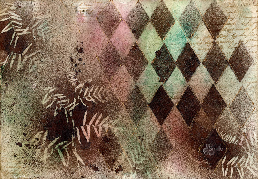 Теперь в нескольких местах ставлю штамп "французский текст", а границы ромбов немного выделяю при помощи бронзового контура, края тонирую дистрессом.