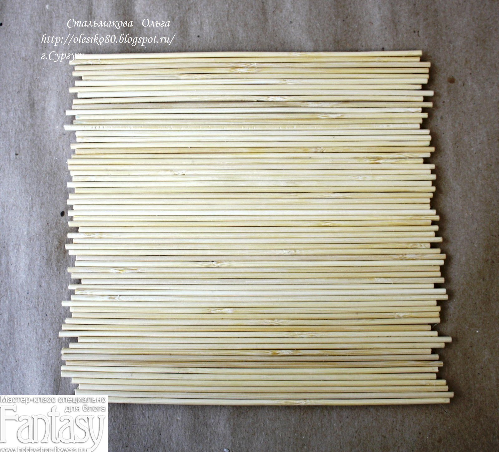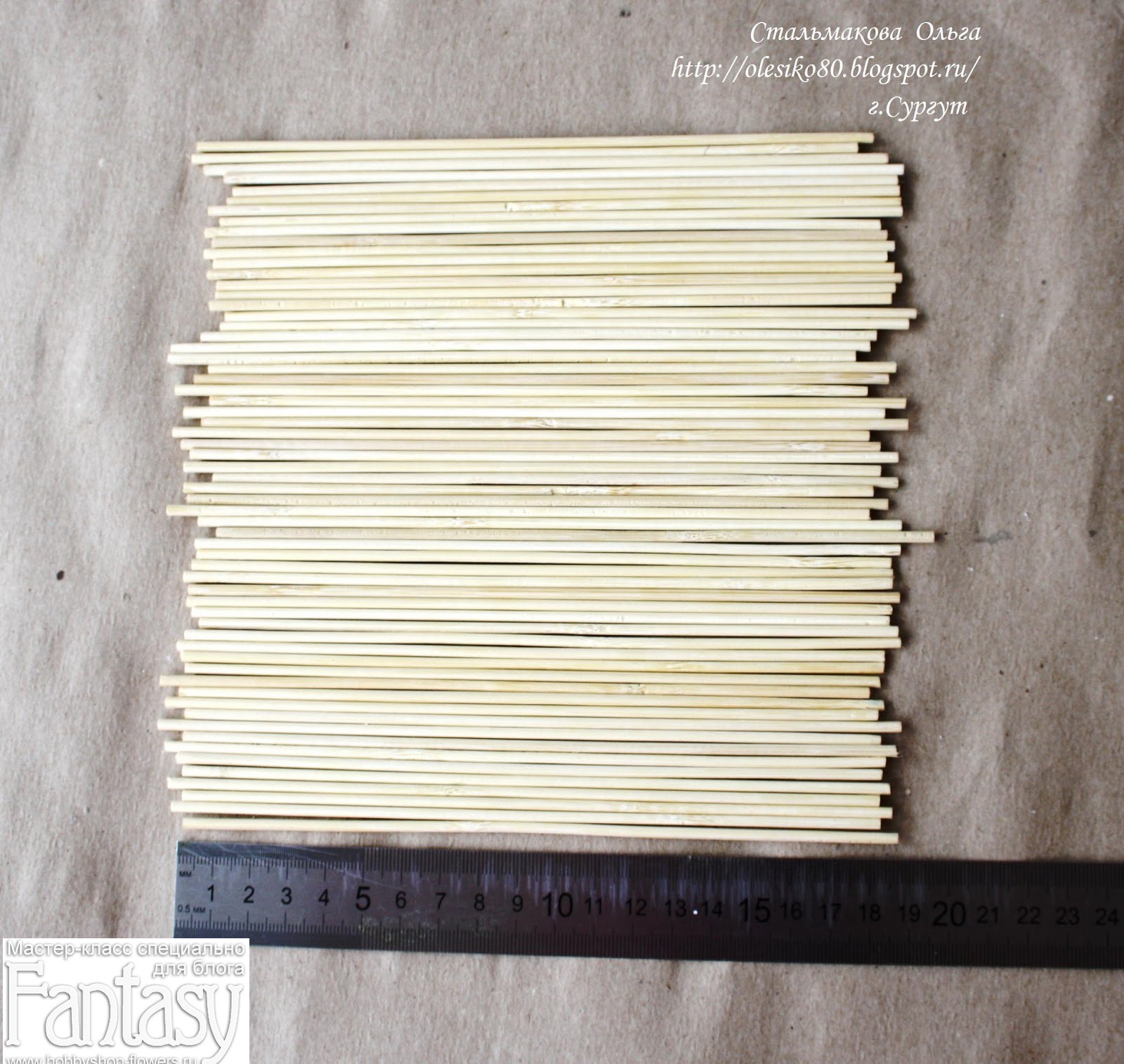 2. Далее необходимо сразу определиться с размером панно, я решила, что моё будет примерно 20х20 (вышло 18х19 см). На самом деле размер одной шпажки в моём наборе был 20 см, при отрезании острого кончика, длина стала около 19 см.
