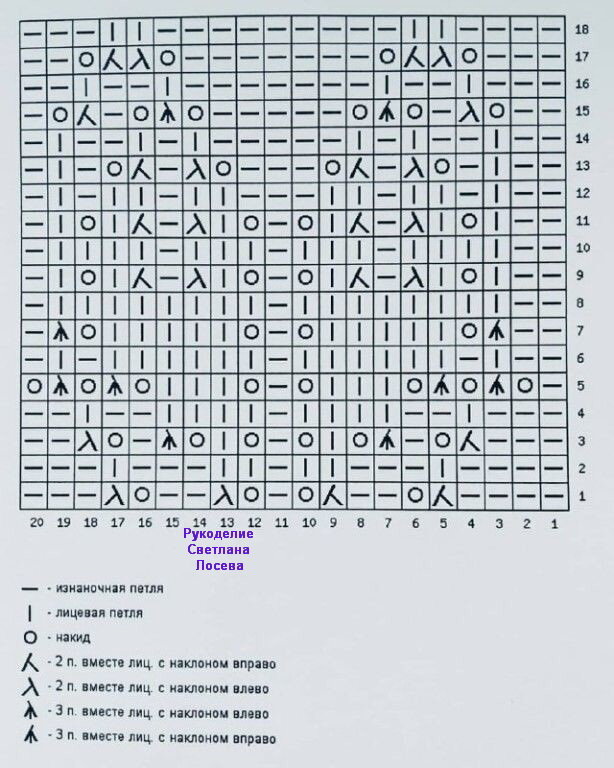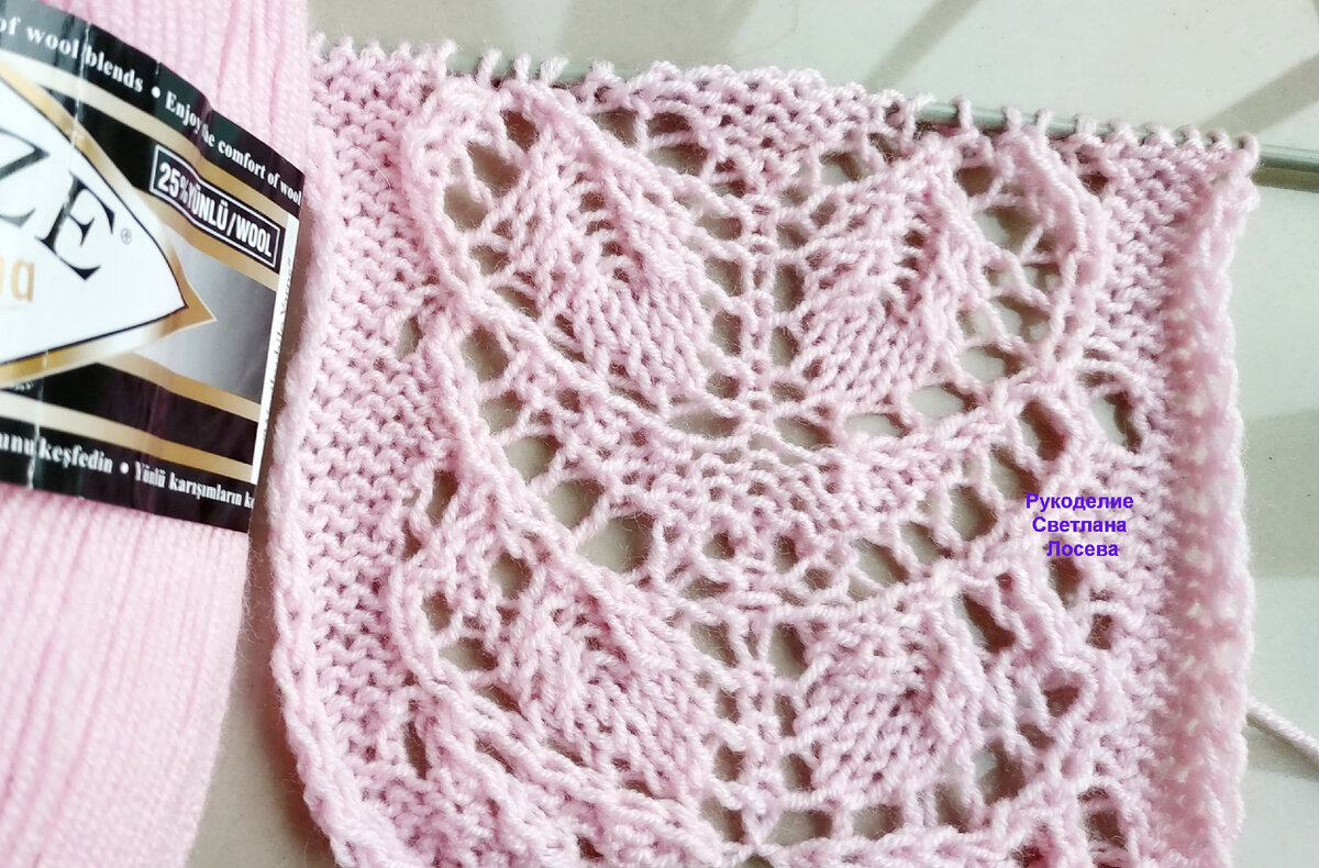 Продолжить работу, распределяя узоры: 1 кр.п., 4 (5) изн., 19 п. ажурным узором, 4(5) изн, 19 п. ажурным узором, 4 (5) изн., 1 кр.п.