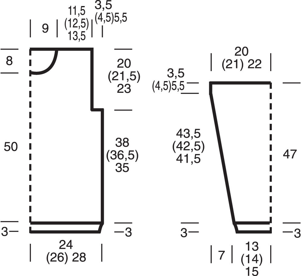 Для скругления по внутреннему краю закрыть в каждом 2-м ряду 1 x 5 п., 2 x 2 п. На высоте спинки закрыть оставшиеся по 18 (20) 22 п. плеч.