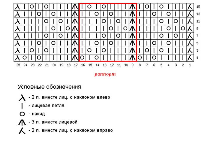 Ажурный узор листочки со схемой и текстовым описанием. Раппорт 12 петель, 28 рядов. Набирается количество петель кратно 12 + 2 петли для симметрии + 2 кромочные. Узор вяжется как поворотными, так и круговыми рядами. Бока полотна ровные, сшиваются обычно.