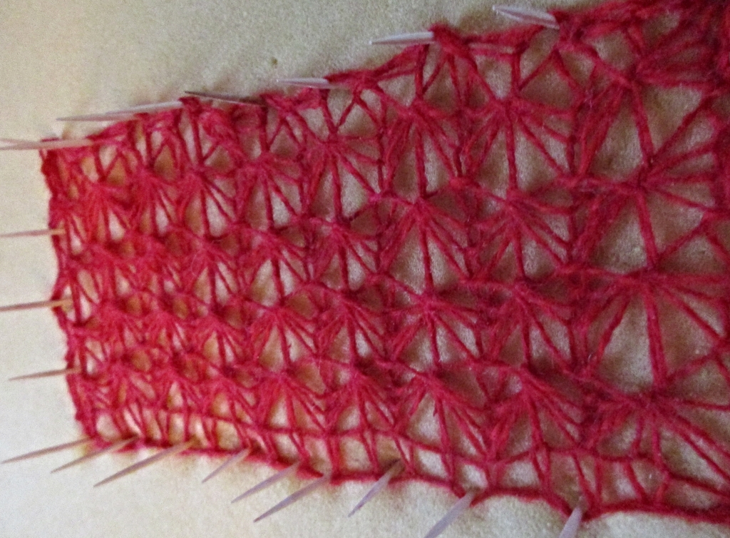 Я взяла спицы в 3 раза толще и пряжу в 3 раза тоньше.Связала ещё раз образец, очень сильно его растянула (до предела) и закрепила деревянными зубочистками на пенопласте.Оставила до полного высыхания. Когда это высохло-это меня просто шокировало! Вот что получилось:
