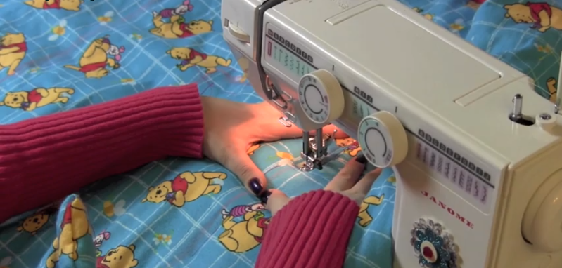Для того чтобы стеганое одеяло держало форму, прошиваем на машине в центре 2-3 прямые полосы.