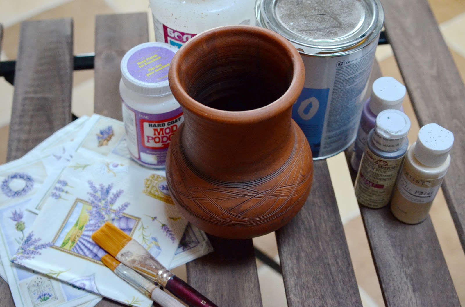Нам понадобиться: глиняные крынки, акриловая краска белого или молочного цвета, салфетки, клей ПВА, лак акриловый, лак в баллончике, краска сиреневая и патина на водной основе ( можно заменить акриловой краской жженая умбра), мелкая наждачная бумага, поролоновая губка.