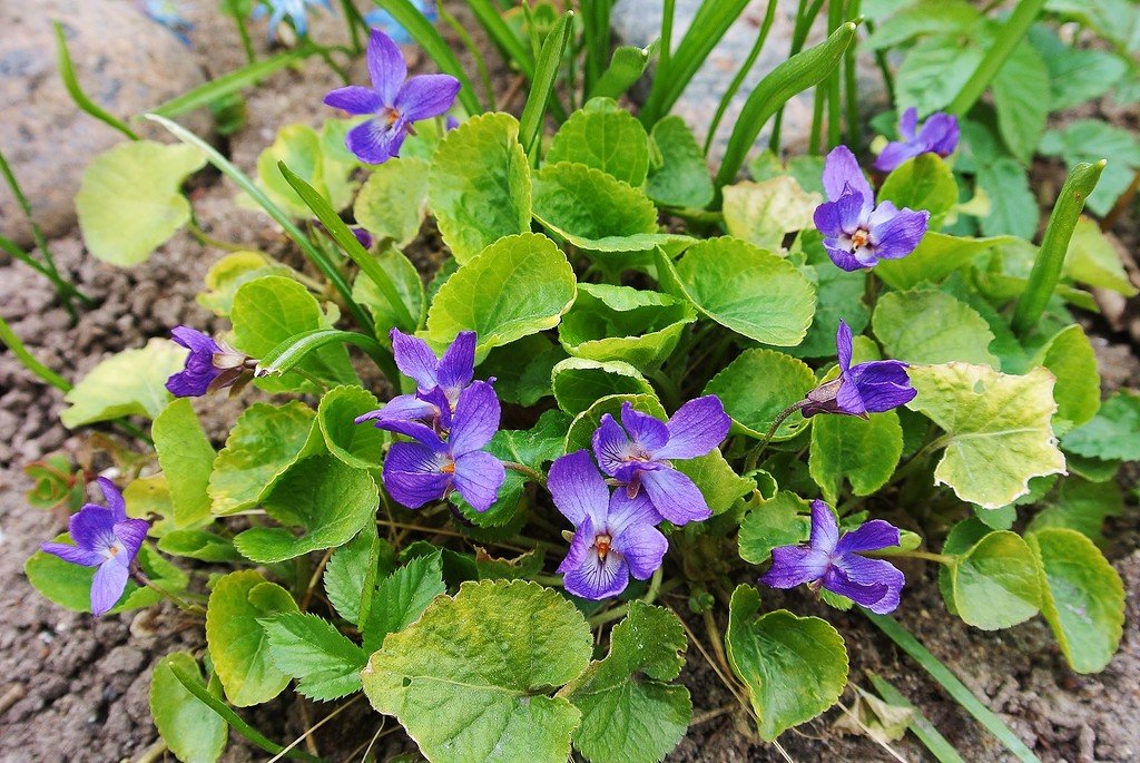 Фиалка душистая Viola odorata — 10 — 15 см. Белый или голубой цвет. Душистый. Цветки диаметром 2 см. Цветет в мае.