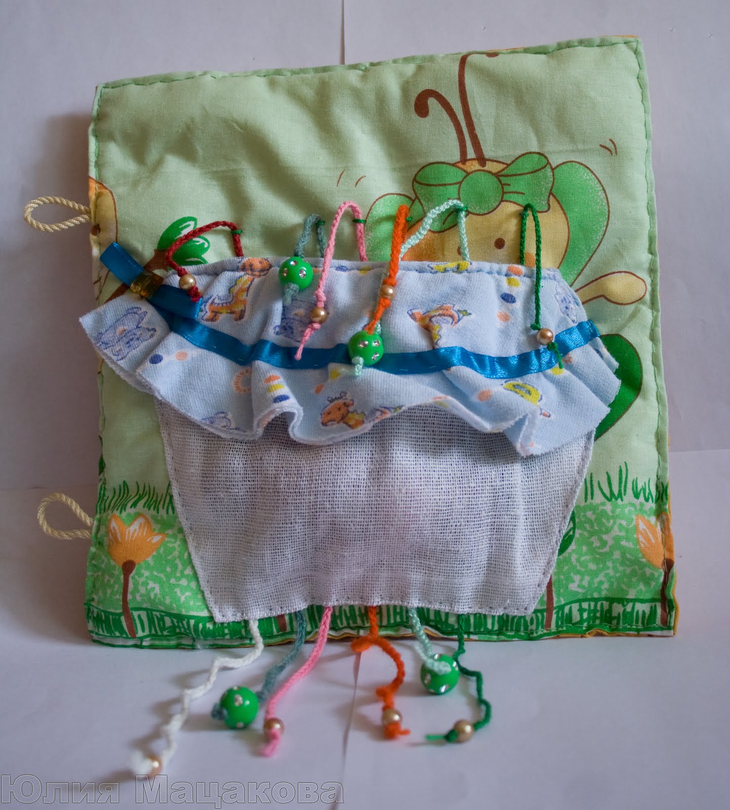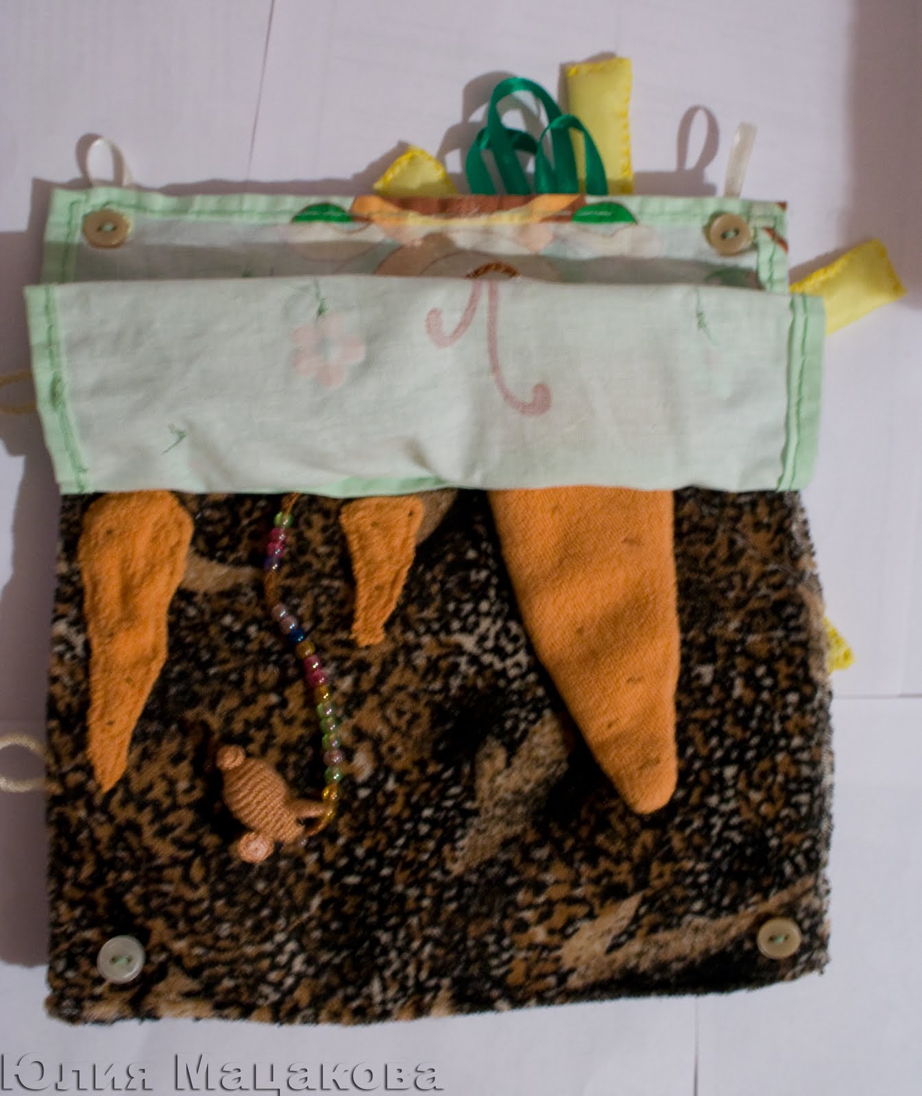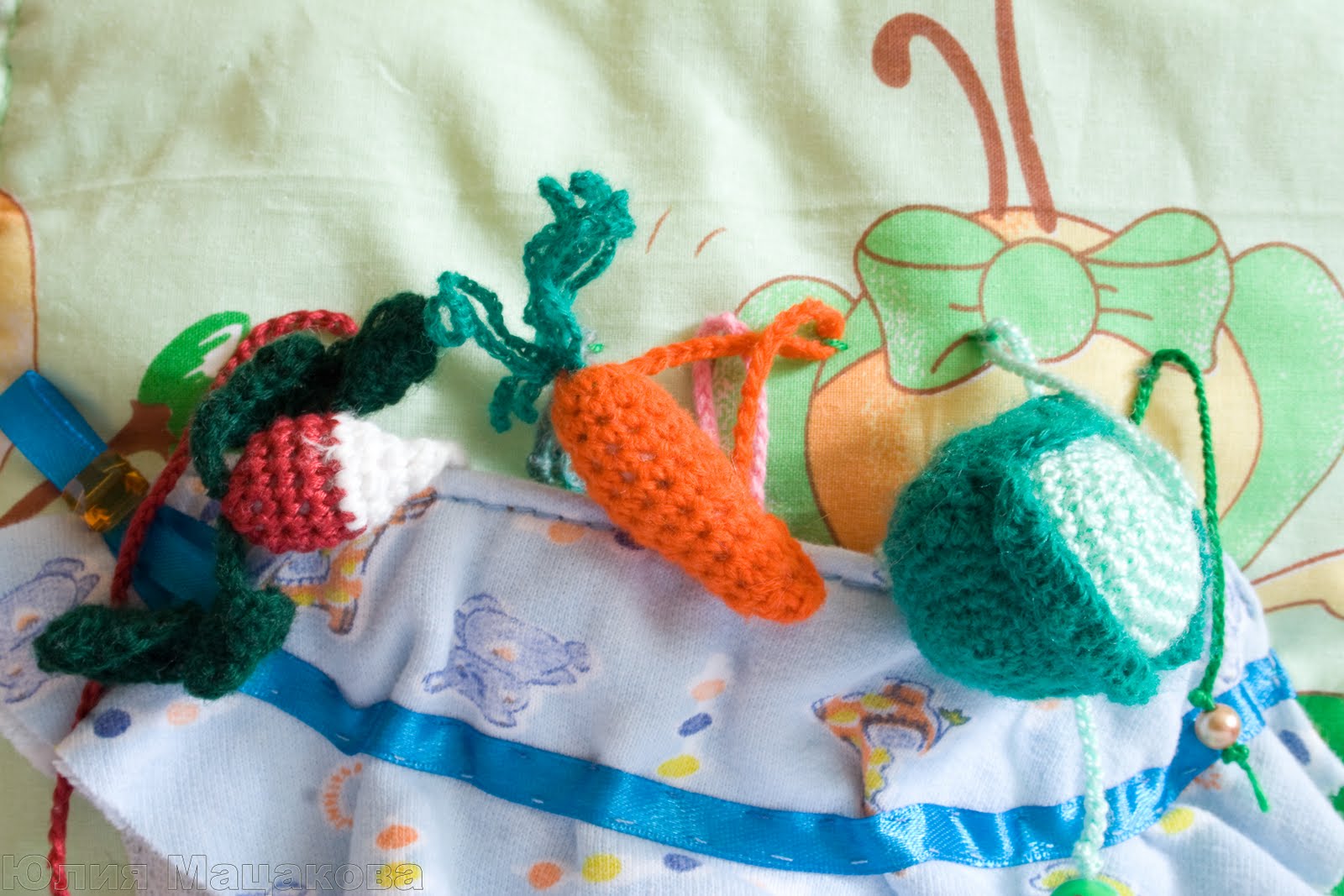 Оба прута я в несколько слоев обмотала синтепоном и втиснула в "трубу" из бязи. На "трубу" предварительно нашила петельки и пуговицы для того, чтоб можно было подвешивать разные игрушки и погремушки. Оба прута связала вместе посредине шнуром. Концы прутьев пропустила через одеяльце и закрепила на раме.