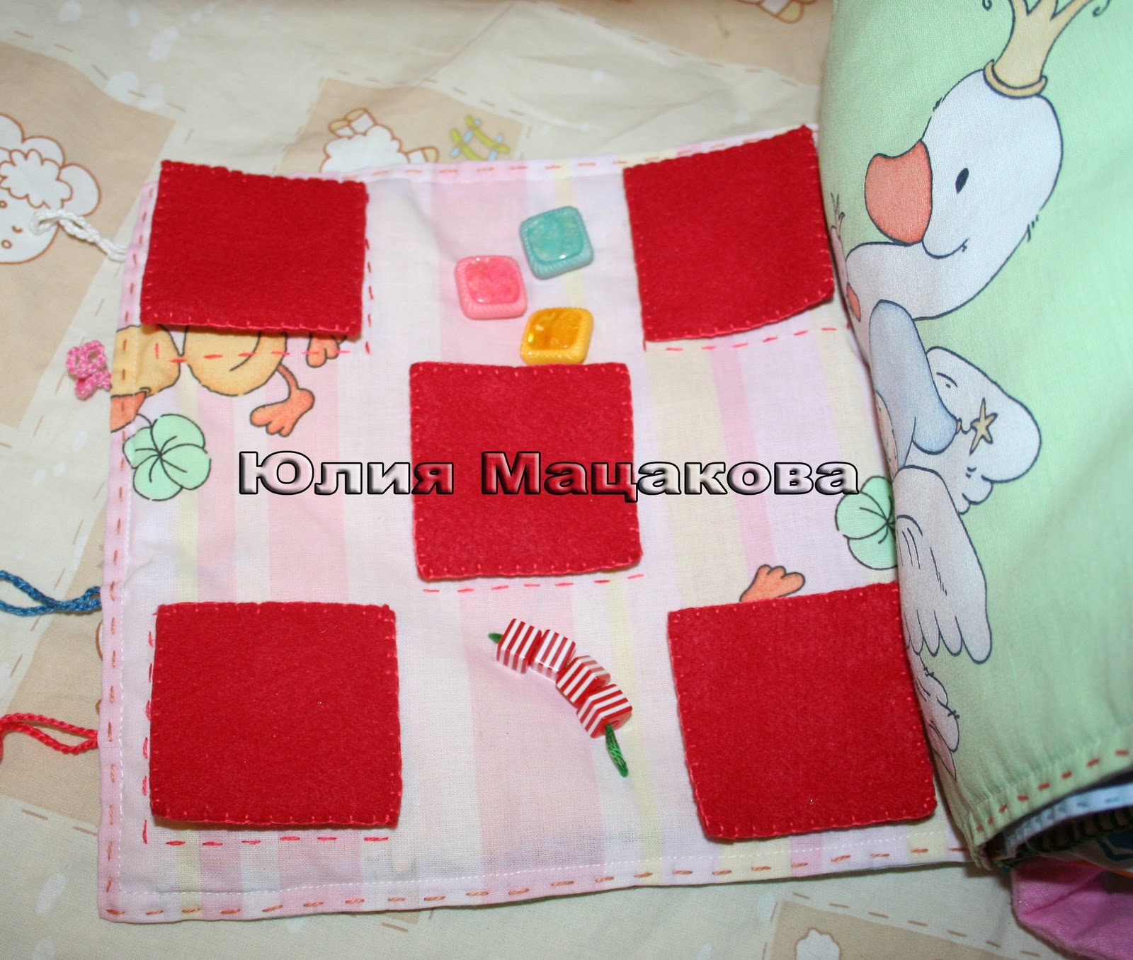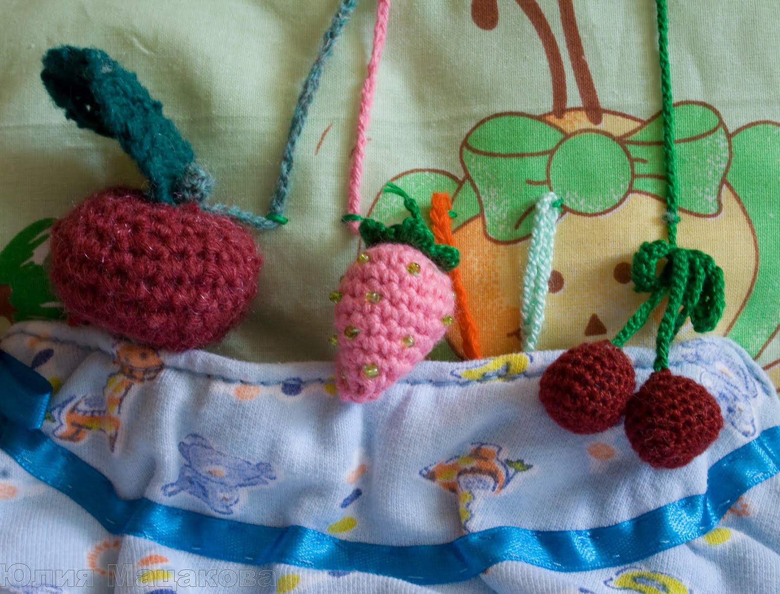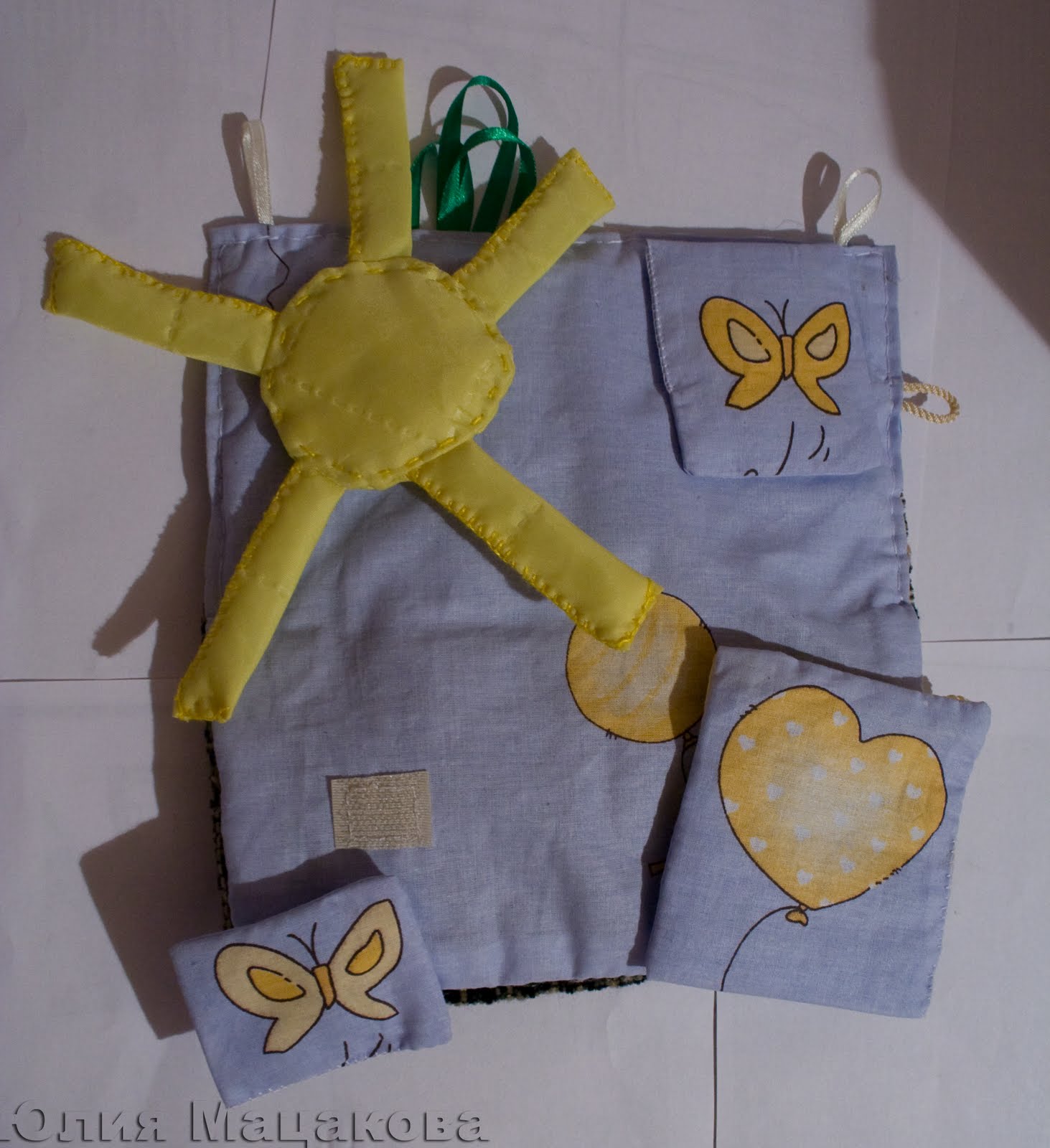 Оба прута я в несколько слоев обмотала синтепоном и втиснула в "трубу" из бязи. На "трубу" предварительно нашила петельки и пуговицы для того, чтоб можно было подвешивать разные игрушки и погремушки. Оба прута связала вместе посредине шнуром. Концы прутьев пропустила через одеяльце и закрепила на раме.