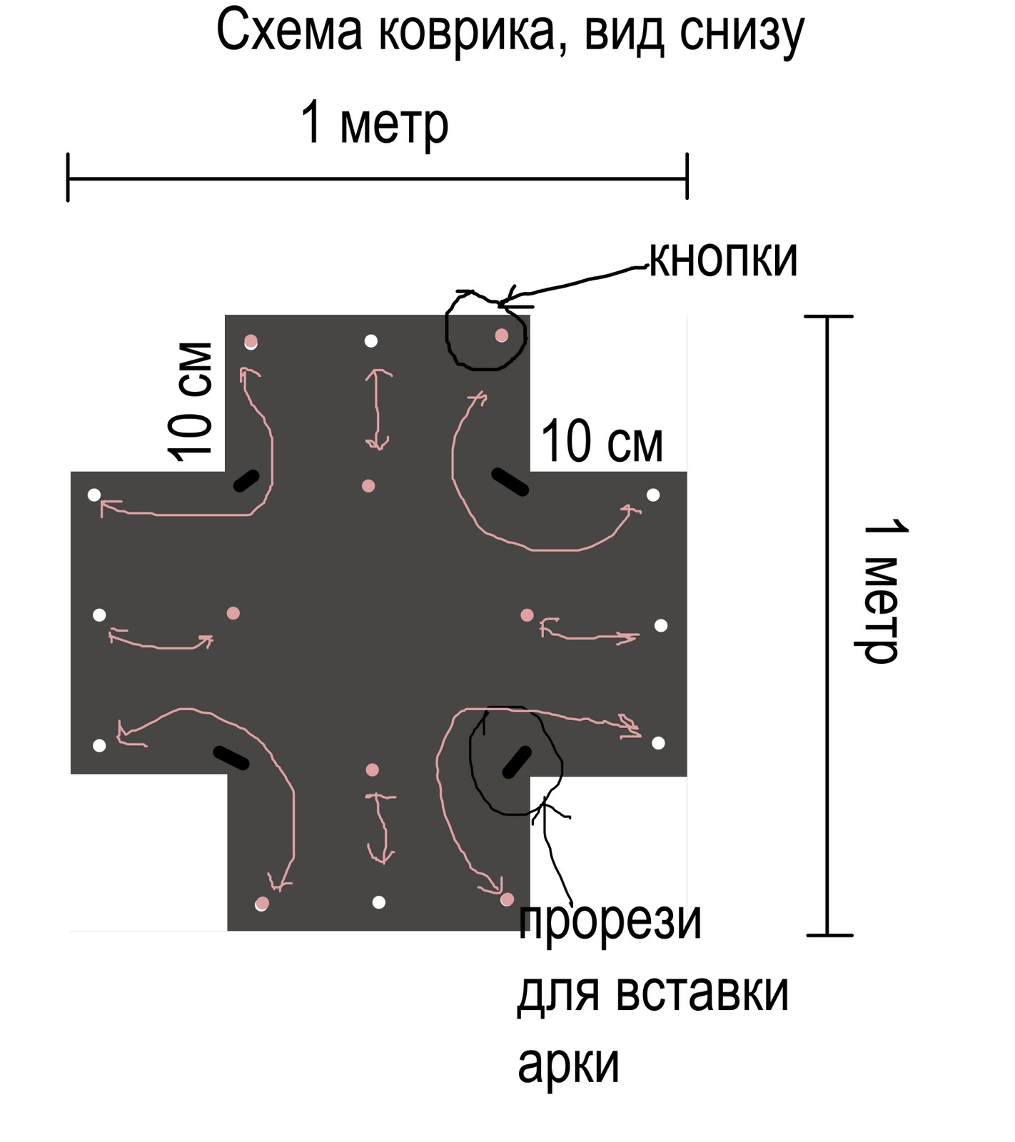 Сшила одеяльце из плотной бязи (схема ниже). Проложила двумя рядами синтепона и простегала. В одеяльце сделала прорези для вставки арки, которая под одеяльцем крепилась на раму болтами. Раму сделал муж из тонких стальных прутиков, скрепленных уголками. Прорези отметила на схеме. Края одеяльца подвернула под раму и закрепила кнопками (отмечены на рисунке). Нужно учесть, что при подворачивании, края одеяла находят друг на друга, т.е. кнопки на краях должны быть из одной пары. На схемке розовые и белые кнопки - это те, которые будут друг к другу крепиться. Стрелками показаны пары кнопок.