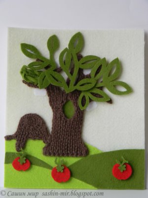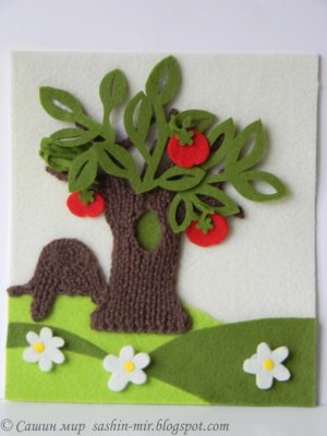 У нас лето. На дереве зеленые листочки, спелые яблочки. Трава зеленая, цветут ромашки.