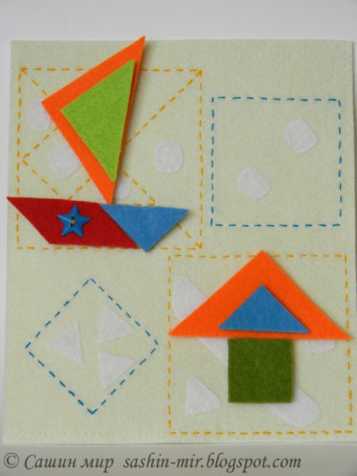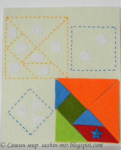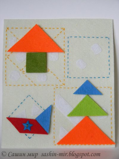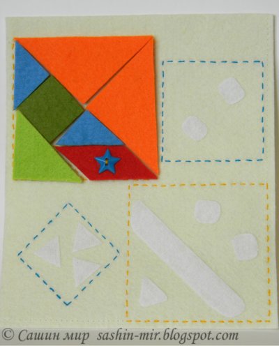 Веселая геометрия по системе Монтессори или по методике Никитиных. Будем складывать квадрат из разных фигур. Первый квадрат, простеганный желтой ниткой, подсказывает сложение фигур. А нижний квадрат уже без подсказки.