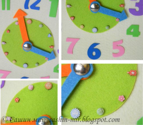 Страничка - часы. Основа и стрелки из фетра, цифры - это готовые наклейки, сделаны из вспененного EVA (этот материал используют для изготовления мягких бигуди или досок для плавания). Для обозначения каждого часа решила воспользоваться детскими бусинами.