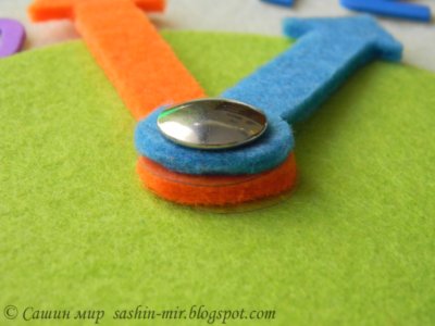 Стрелки должны двигаться, а фетр будет создавать трение, поэтому я проложила между стрелками и основанием кружочки из прозрачного пластика. Теперь стрелки легко двигаются. Крепление - это пуговица. Но ножка пуговки коротка для такого слоя фетра, поэтому продолжением ножки и крепежом к основе служит проволочка.