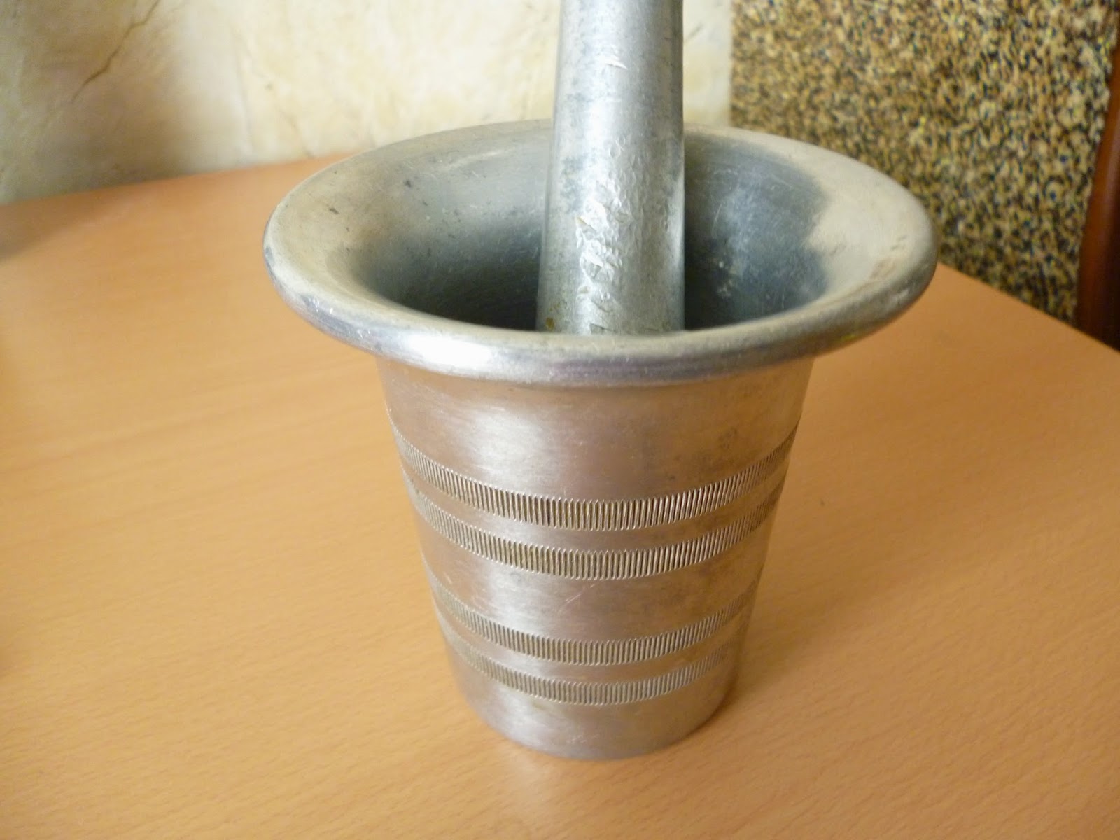 Приготовим маринад.Чеснок растолочь в ступке с щепоткой соли.У меня вот такая ступка,которой уже много-много лет.