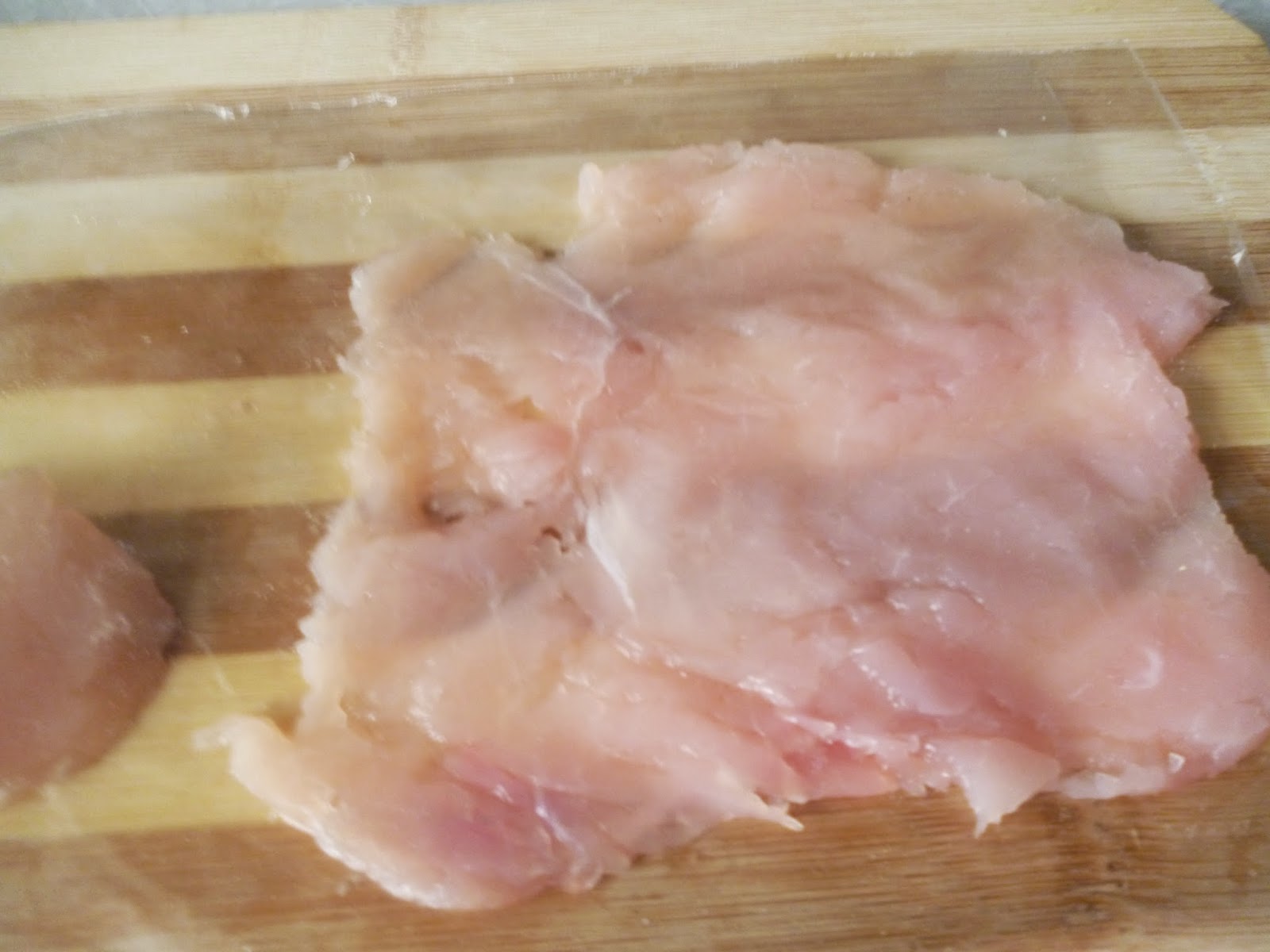 Аккуратно отобъем каждый кусок через пленку до толщины чуть меньше 1 см.