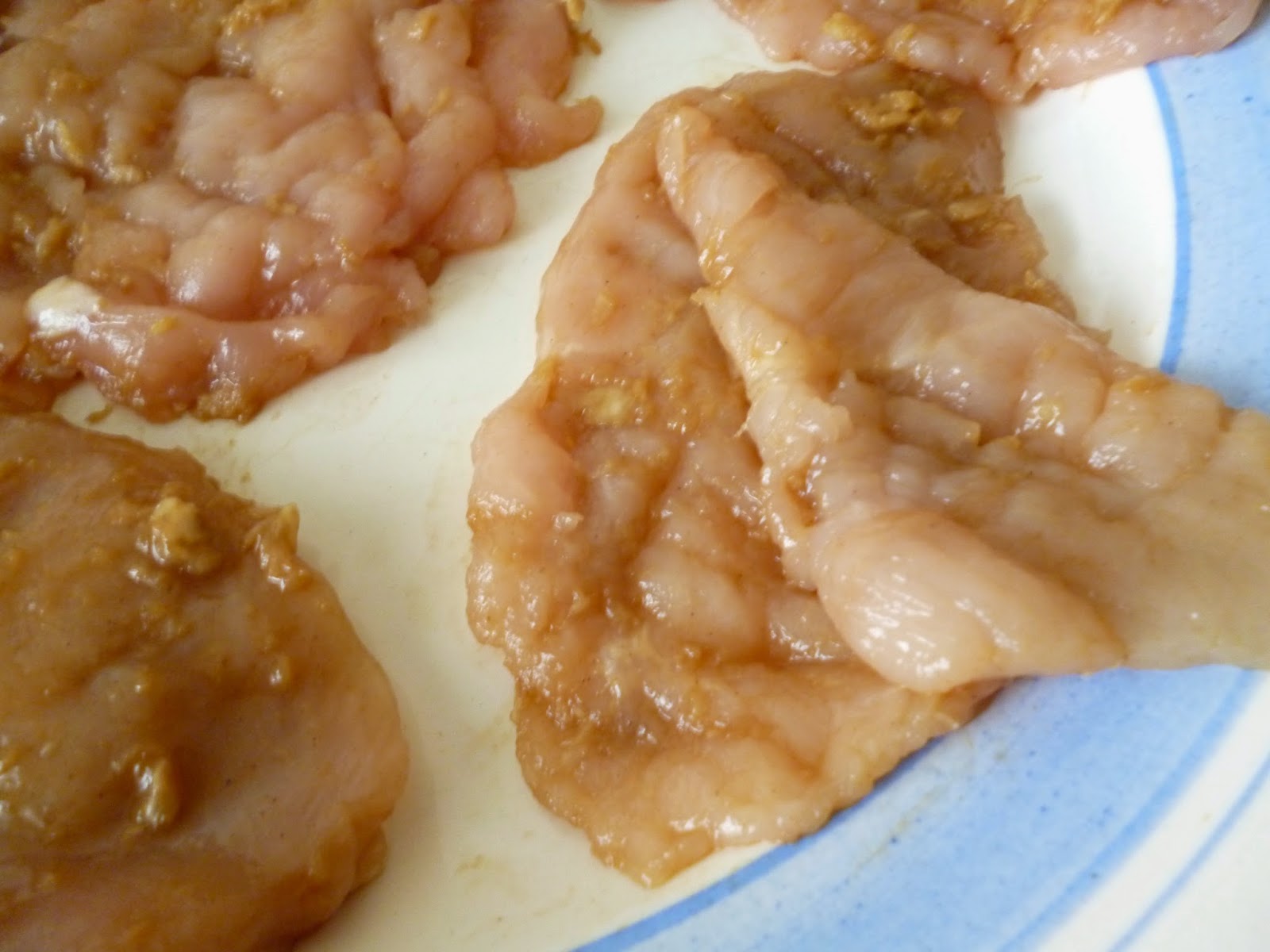 Теперь берем два отбитых филе,сначала смазываем с двух сторон один кусок,на него выкладываем второй и смазываем уже только верхнюю часть.На этом фото я отогнула краешек верхнего филе,что бы было понятней.И так попарно смазываем и соединяем все остальные отбитые кусочки.Накроем крышкой и отправим на 30 минут в холодильник.