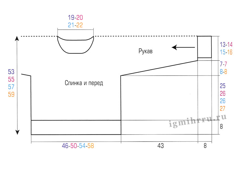 Пуловер вяжется единым полотном, начиная с левого рукава. Стрелка на выкройке - направление вязания.