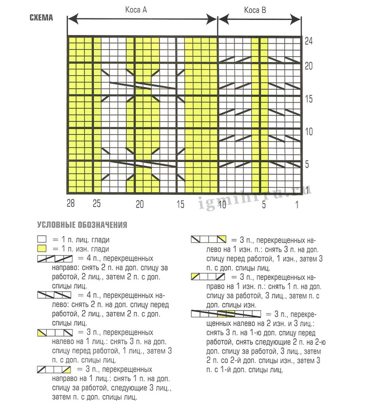 3-й р: 4 изн., 3 п., перекрещенных налево на 1 лиц., 2 изн., 3 п., перекрещенных направо на 1 лиц., 4 изн.