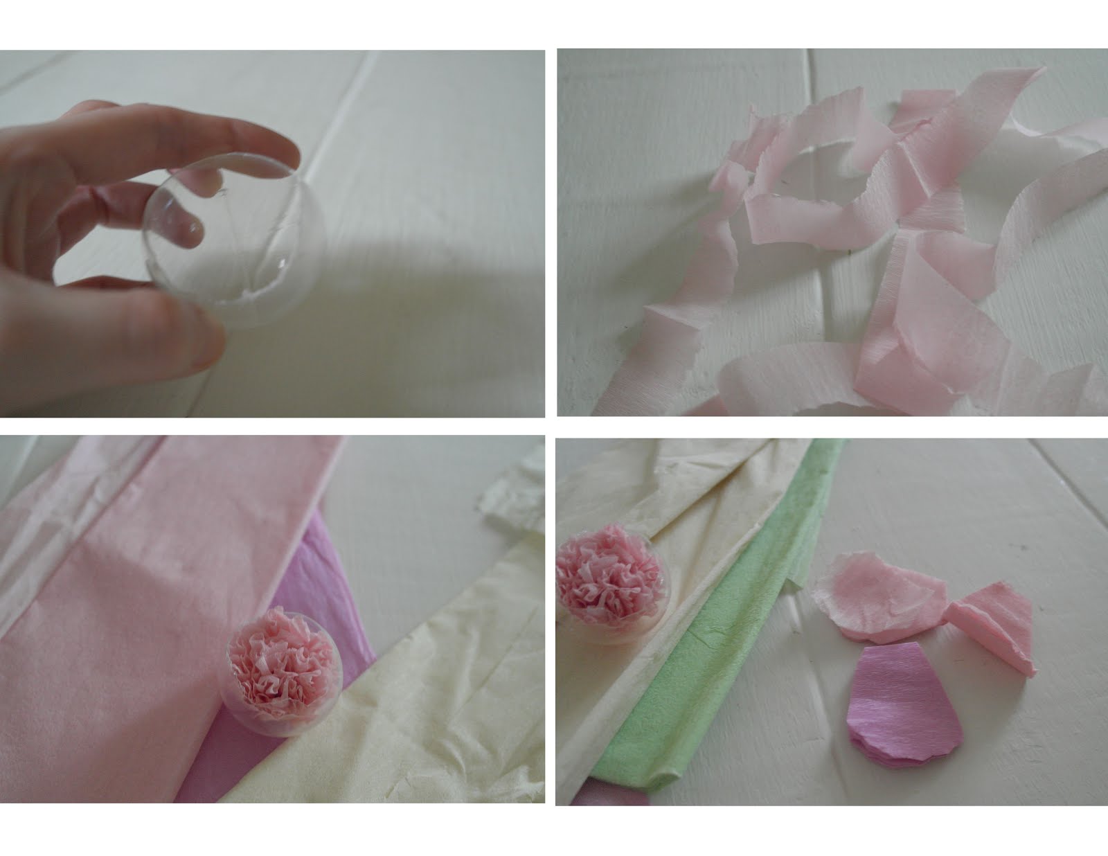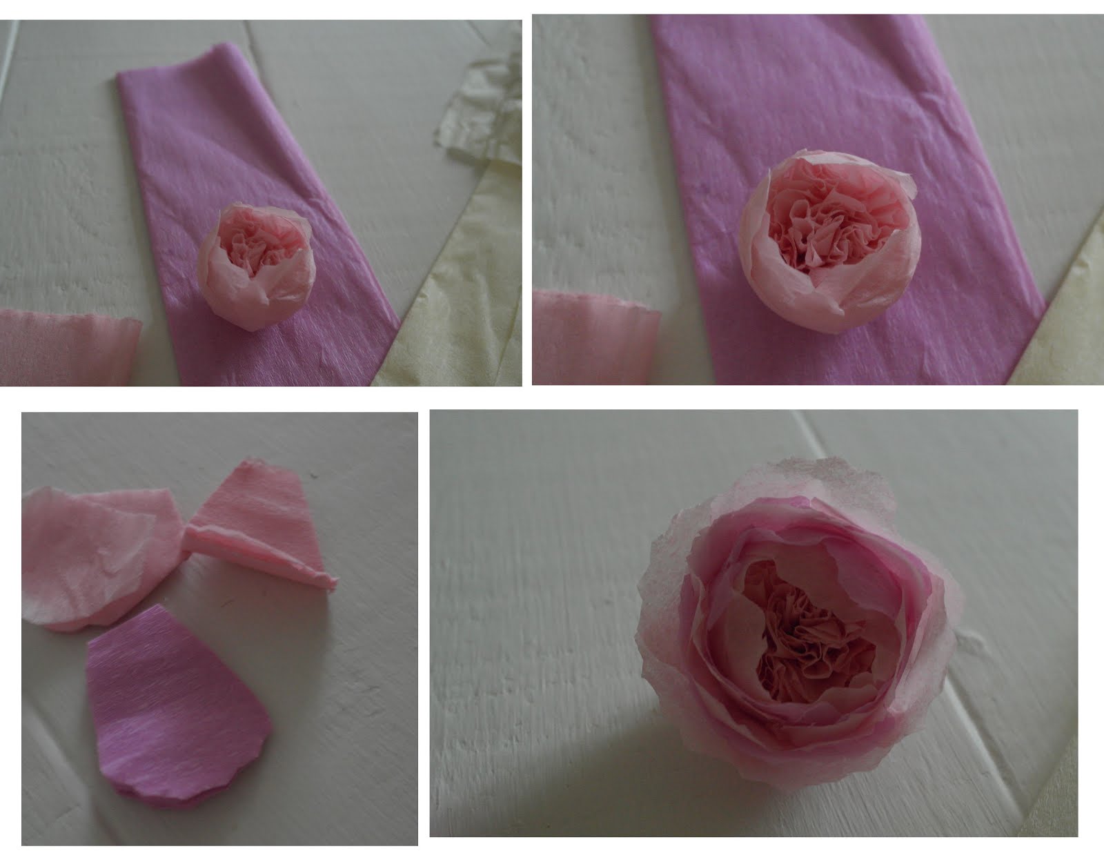 сложить в несколько слоев крепированную бумагу, а затем вырезать лепестки формы с взъерошенными края. ( это означает, что вы вырезаете много лепестков за один раз), а затем начать склеивание их на емкости, добавьте немного более темного цвета между светлыми и приклеить их.
