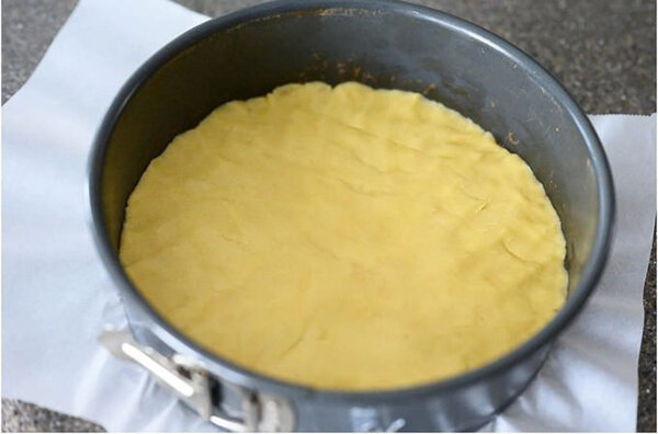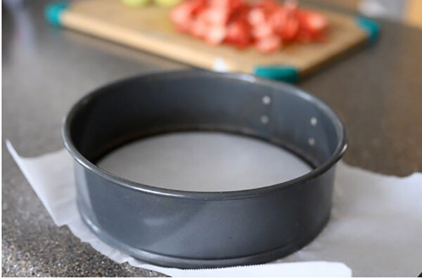 Положите пергаментную бумагу на дно разъемной формы диаметром 24 см. Я предпочитаю заправлять пергаментную бумагу между боками и дном разъемной формы. Таким образом, сок от начинки будет оставаться внутри формы, а не вытекать в духовку.