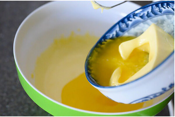 Добавьте размягченное сливочное масло. Масло должно быть комнатной температуры. Также можно растопить масло в микроволновке. Просто убедитесь, что оно достаточно остыло. Смешайте масло с яично-сахарной смесью.