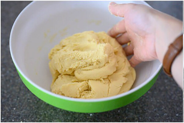 Как только тесто немного смешается, руками аккуратно замесите его. Тесто должно быть мягким на ощупь, но не липким. На самом деле оно очень воздушное и пышное.