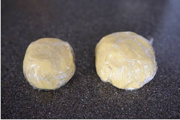 Оберните каждый кусок пленкой, поместите меньшую часть теста в морозильную камеру, чтобы она затвердела. Большую часть храните в холодильнике до тех пор, пока она не понадобится.