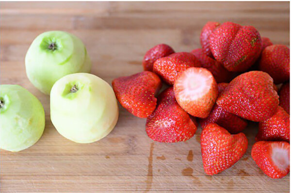 Если вы используете яблоки вместе с клубникой (моя любимая комбинация), очистите их. Очистите клубнику и нарежьте ее вдоль на кусочки.