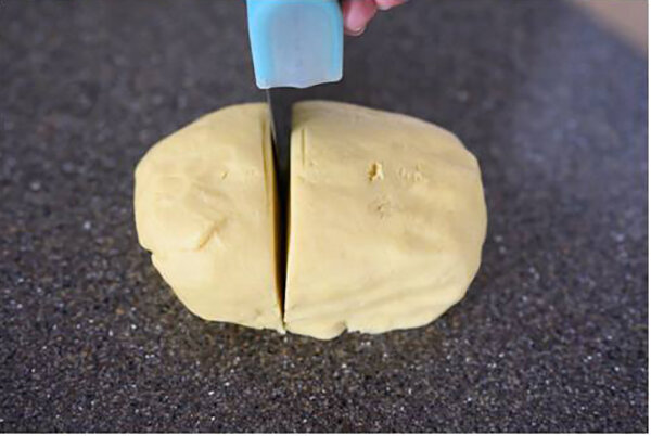 Разделить готовое тесто на две части: одну побольше, другую поменьше. Большая часть уйдет на дно формы для запекания. Меньшая будет использоваться в качестве крошки по верху пирога.