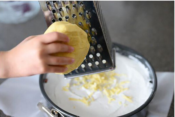 Натереть яблоки на крупной терке и выложите их ровным слоем поверх теста.