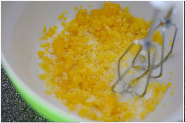 Желтки взбейте с 3/4 стакана сахара. Через некоторое время смесь станет бледно-желтой.