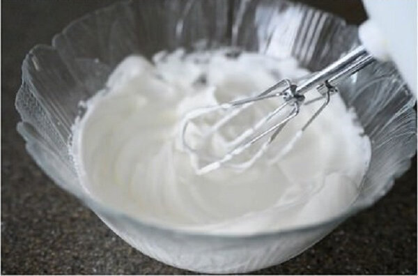 Выньте оставшиеся яичные белки из холодильника и взбейте их с 1/2 стакана сахара. Взбивайте их около 5—6 минут — до образования белых пиков.