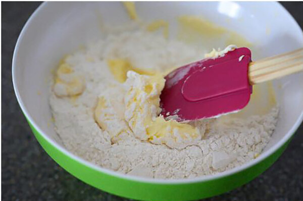 Медленно добавляйте муку и перемешивайте все ингредиенты ложкой или лопаткой. Обычно достаточно 2 стаканов муки (стакан на 250 мл). Если после этого вам кажется, что муки недостаточно (зависит от её качества), добавьте еще до половины стакана муки.