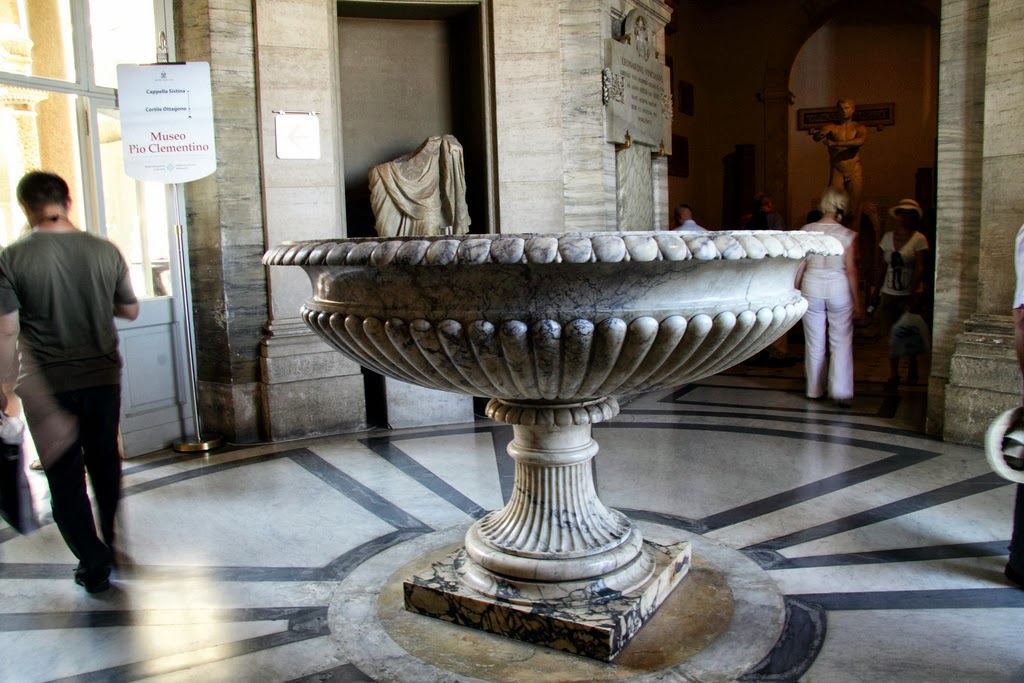 Пройдя Квадратный Вестибюль,мы попадаем в Круглый Зал.Из Круглого Зала,задуманного Симонетти как "связной элемент",начальной части Музея Пия-Климента.В названии музея объединены имена двух понтификов:Климента XIV (Ганганелли, 1769-1774 гг.), основателя Музея Пия VI (Браски, 1775-1799 гг.) придавшего ему окончательную форму. Посреди Круглого Зала огромная садовая чаша времен Римской Империи.