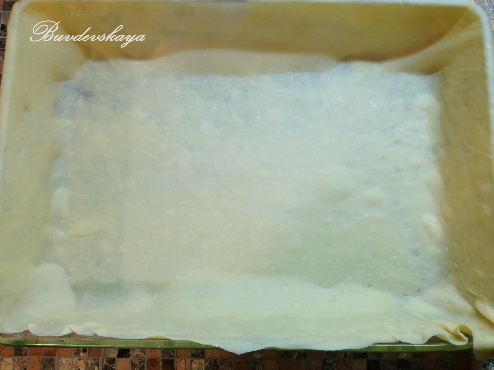 4. Форму для запекания (у меня 35 на 24 см) смазать маслом (сливочным). Большую часть теста раскатать скалкой в очень тонкий пласт размером большим чем форма. Выстелить форму раскатанным тестом так, чтобы края теста свисали с формы.