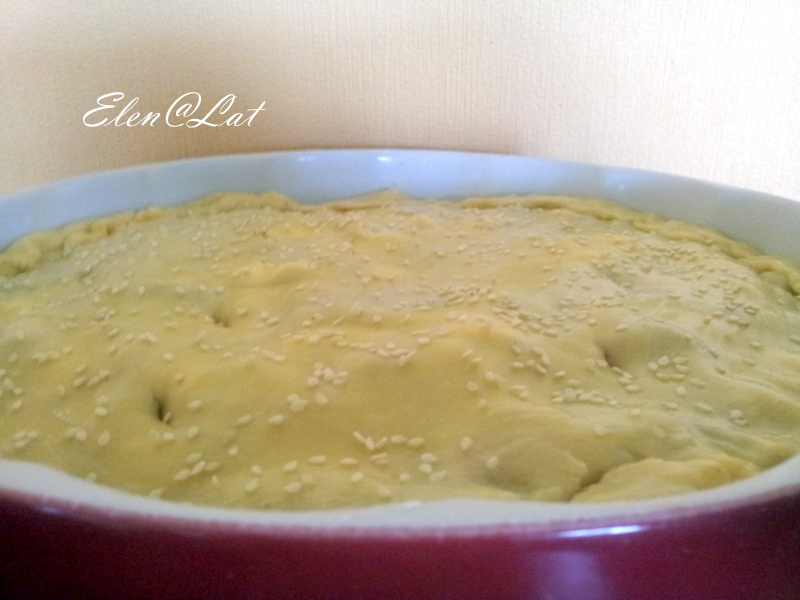 Затем раскатываем второй кусок теста и накрываем им овощи, таким образом формируя пирог. Защипываем края и в нескольких местах прокалываем пирог вилкой. Пирог смазываем взбитым яйцом и посыпаем кунжутом.
