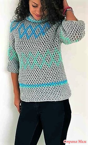 Стильный и молодежный этот свитер вяжется очень просто.Он выполняется от горловины регланом.Робовидные цветные ромбы делают его еще более привлекательным.Подойдет на каждый день.