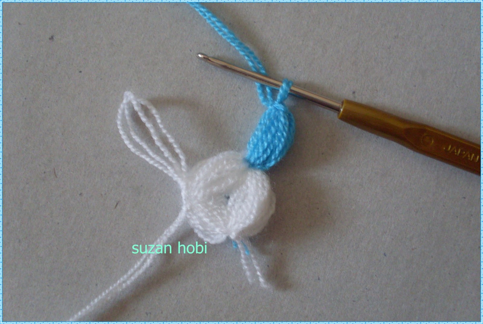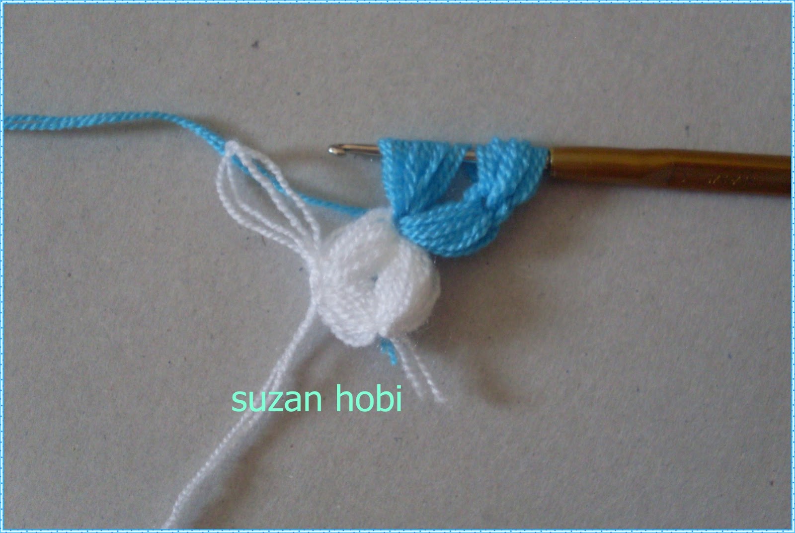 şimdi bir üst sıraya geçicez ,geçicez ama nasıl, bu kısımları çokkkk detaylı resimleyip anlatmaya çalıştım arkadaşlar:))tığımla beyaz ilmeğimi uzunca tabii çekerek alıyorum ve bu şekilde mavi ipimle olan ilmeğin içinden geçirerek mavi ipimi sıkıca çekiyorum,
