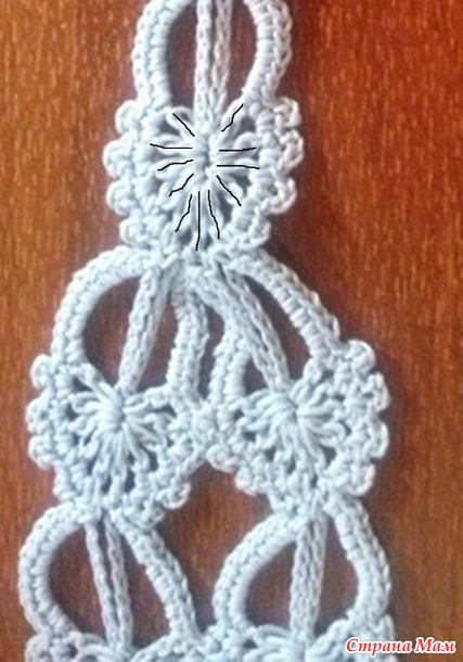 Дальше довязываю перышки до конца ряда, начинаю обвязывать другую сторону полоски до того перышка, где у нас 11 С1Н. Перехожу на соседнюю арочку (на фото отмечено кружком) и начинаю вниз вязать 5 перышков. Далее обвязываю с другой стороны как обычно.