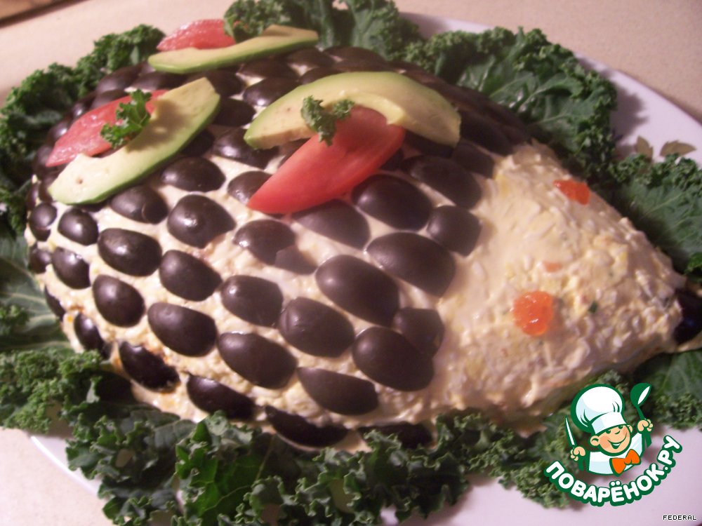9-й слой- украсить маслинками, поделенными на пополам. "Мордочка" яичный желток, а полянку можно делать на свой вкус!