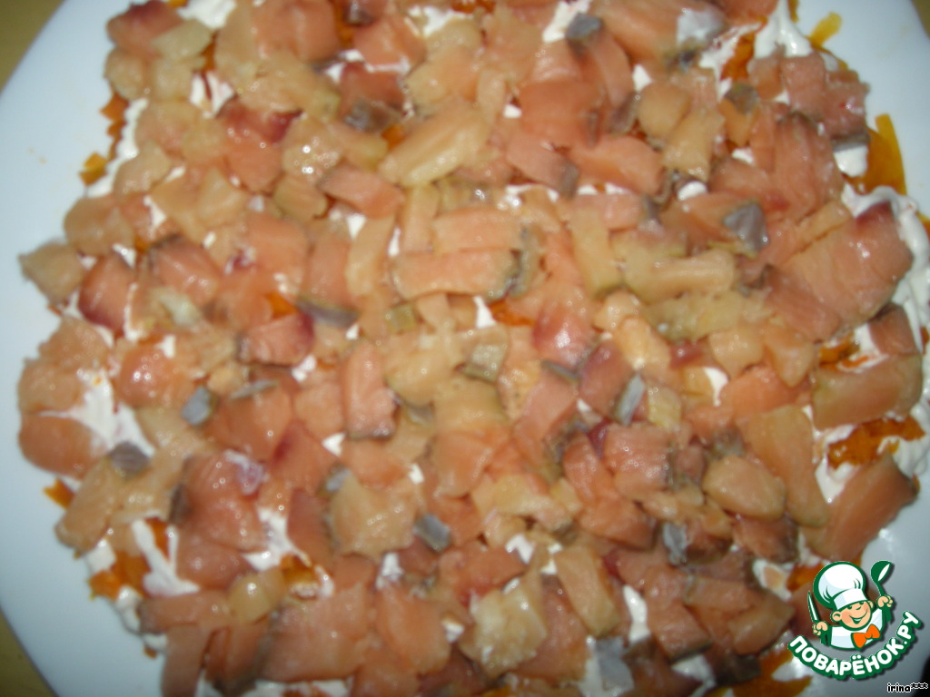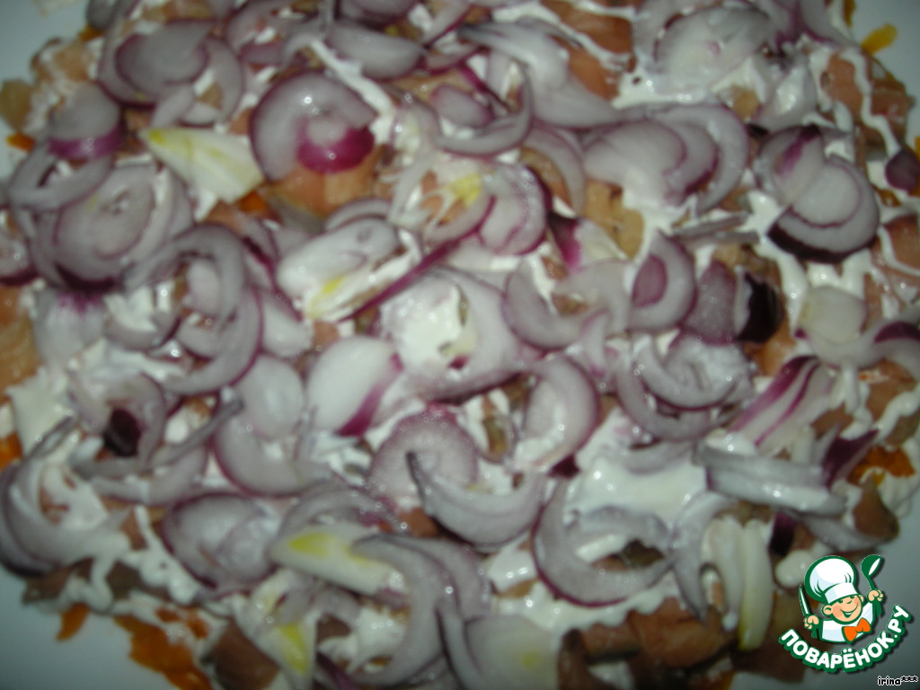 2-й слой - лук мелко покрошить, но предварительно отмоченный в воде.
